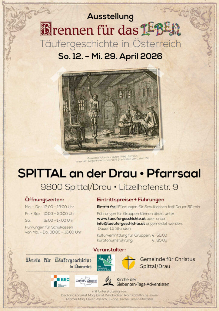 Führungen für Gruppen können direkt unter www.taeufergeschichte.at oder unter info@taeufergeschichte.at angemeldet werden.